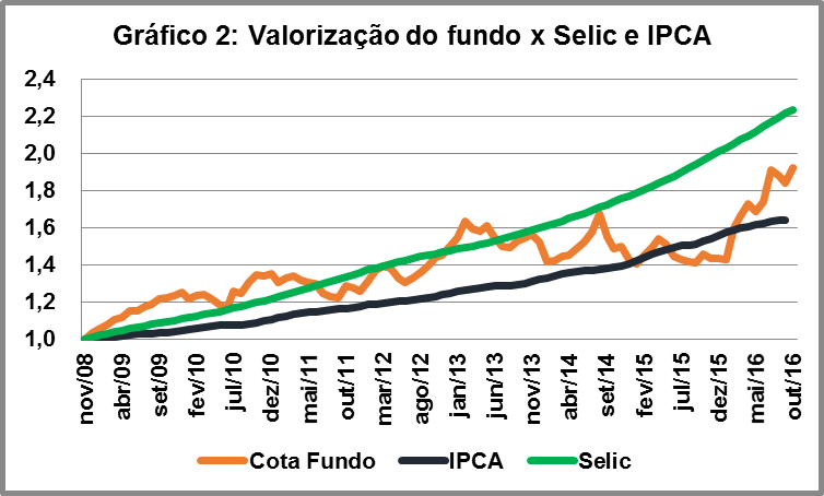 - Desde que foi constituído, em poucos momentos o Fundo rendeu mais que a Selic, indexador dos títulos públicos federais considerado de menor risco;