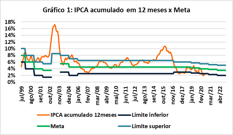 O Índice de Preços ao Consumidor Amplo (IPCA) acumulado em 12 meses está em 2,44%, levemente abaixo do piso da meta de inflação de 2020 (Gráfico 1). Além disso, a expectativa do mercado é que o IPCA fique próximo da meta – que vem caindo anualmente – até 2023. Sob essa perspectiva, a inflação não é um problema relevante no presente e no futuro próximo.