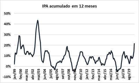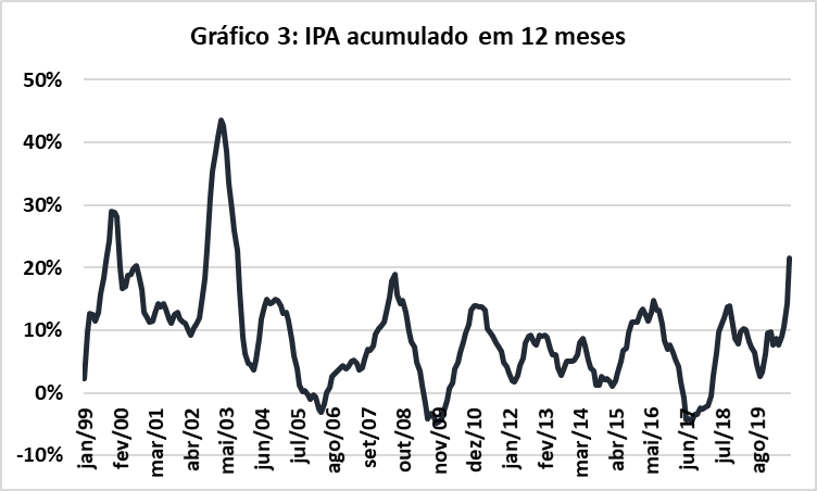 Outro aspecto que merece atenção é a evolução dos preços do atacado desde maio. Nesta semana, a Fundação Getúlio Vargas (FGV) divulgou que o Índice de Preços ao produtor Amplo (IPA) aumentou 5,44% em agosto, resultando em aumento acumulado de 21,6% nos últimos 12 meses, patamar que não ocorria desde o terceiro trimestre de 2003 (Gráfico 3). Até o momento, os empresários têm acomodado a alta de custos com redução de margens de lucros. Há o risco de que, caso ocorra retomada da atividade econômica, essa alta de custos seja repassada aos consumidores, forçando o Banco Central a elevar a taxa Selic, o que, por sua vez, prejudicaria a (insuficiente) recuperação econômica prevista para 2021.