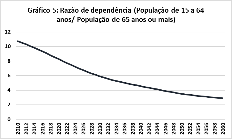 O Brasil é um país cuja população envelhece rapidamente e que há mais de uma década tem taxas de fecundidade abaixo da reposição populacional (2,1 filhos por mulher), sendo que atualmente todas as regiões brasileiras possuem taxa de fecundidade abaixo da reposição populacional. Como resultado, a razão de dependência, número de pessoas em idade ativa por idoso, vai se reduzir drasticamente, de 8,5 em 2019 para 3 em 2060 (Gráfico 5). O Brasil precisaria ter aumentos de produtividade extraordinários e por um longo período de tempo, algo altamente improvável de ocorrer em países de renda média, para que isso não implique aumento explosivo da despesa previdenciária como proporção do PIB.