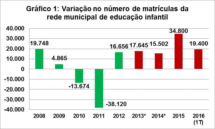 O aumento de 19.400 matrículas de educação infantil nos três primeiros meses de 2016 é o melhor resultado para o primeiro trimestre desde que esses dados passaram a ser divulgados, em julho de 2007 – o segundo melhor ano foi 2015, com incremento de 10.517 matrículas.