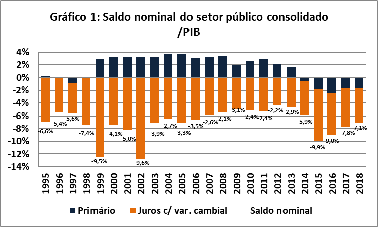 – Em 2018, o déficit público foi de 7,1% do PIB, caindo pelo terceiro ano consecutivo (Gráfico 1), resultado tanto da diminuição do déficit primário, consequência do teto de despesas (Emenda Constitucional 95/2016), quanto da queda da carga de juros da dívida pública;