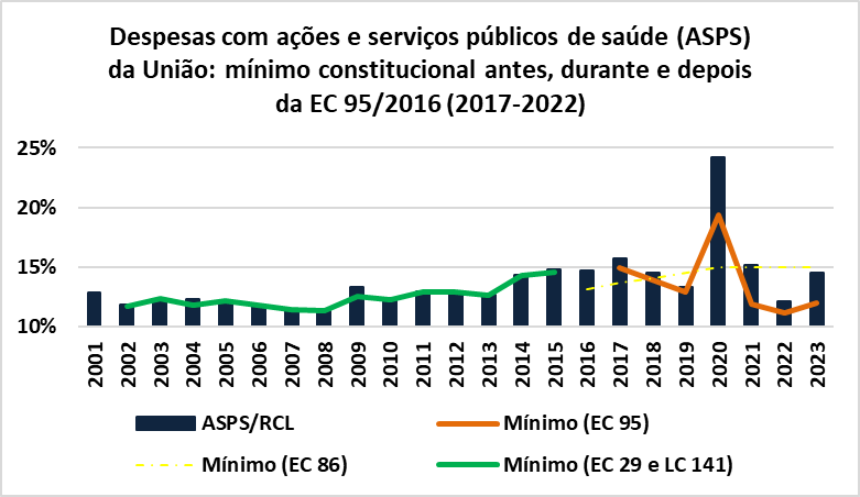 A análise das despesas com ações e serviços públicos de saúde (ASPS) é mais complexa porque a vinculação mínima sofreu diversas mudanças. Antes da EC 95, as despesas mínimas com ASPS da União eram calculadas com base na variação nominal do Produto Interno Bruto (PIB). No segundo governo Dilma foi promulgada a EC 86, que estipulava o orçamento impositivo na saúde e despesa mínima com ASPS como percentual crescente da Receita Corrente Líquida (RCL) até atingir 15% da em 2020. Na época, isso foi considerado “pauta bomba” porque as emendas impositivas dificultavam a governabilidade e ampliavam despesas em um momento no qual o governo tentava promover ajuste fiscal. Devido às despesas atípicas com saúde da pandemia, as despesas com ASPS excederam o mínimo de 15% da RCL em 2020 e 2021. Em 2022, com o fim da pandemia, a despesa com ASPS representou 12,12% da RCL. Embora isso tenha excedido a despesa mínima determinada pela EC 95, esse baixo percentual denotava a dificuldade de se cumprir o disposto na EC 86.