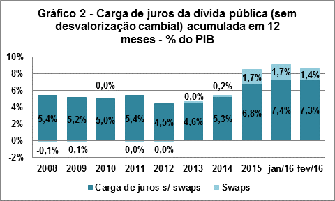 Apesar do baixo crescimento do PIB, entre o segundo semestre de 2012 e o primeiro semestre de 2013, o IPCA cresceu continuamente, estourando o teto da meta de inflação. A partir de abril de 2013, o BCB iniciou processo de alta da Selic para reduzir a inflação. Para limitar a alta da Selic e, com isso, evitar uma desaceleração ainda mais forte da economia, a alíquota de recolhimentos compulsórios sobre posição vendida de câmbio foi zerada, o Imposto sobre Operações Financeiras (IOF) referente a algumas operações de entradas de capitais foi reduzido e, a partir de junho de 2013, o BCB passou a emitir swaps cambiais que em poucos meses atingiram volume superior a USD 100 bilhões (Gráfico 2). O superávit primário reduziu-se para 1,7% do PIB, ou 1,4% do PIB se considerarmos o efeito das pedaladas. Em 2013, o PIB cresceu 3%, mas a inflação estava contida artificialmente por controles artificiais de preços e da taxa de câmbio.